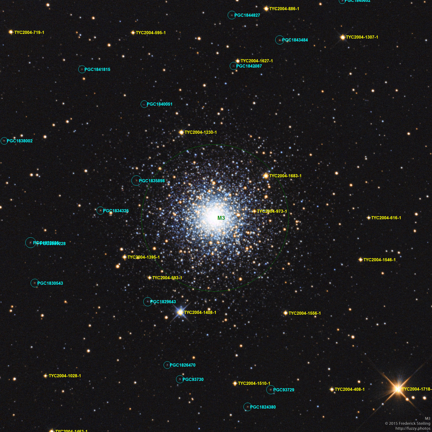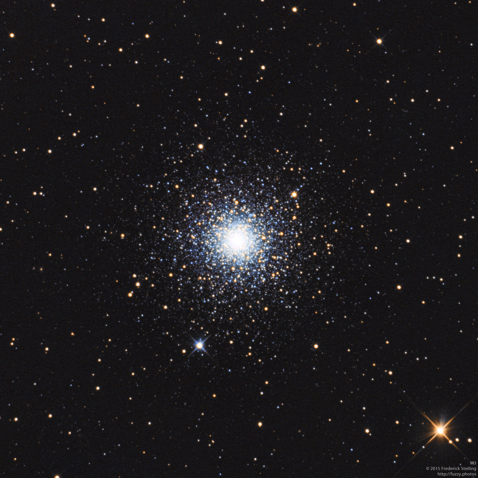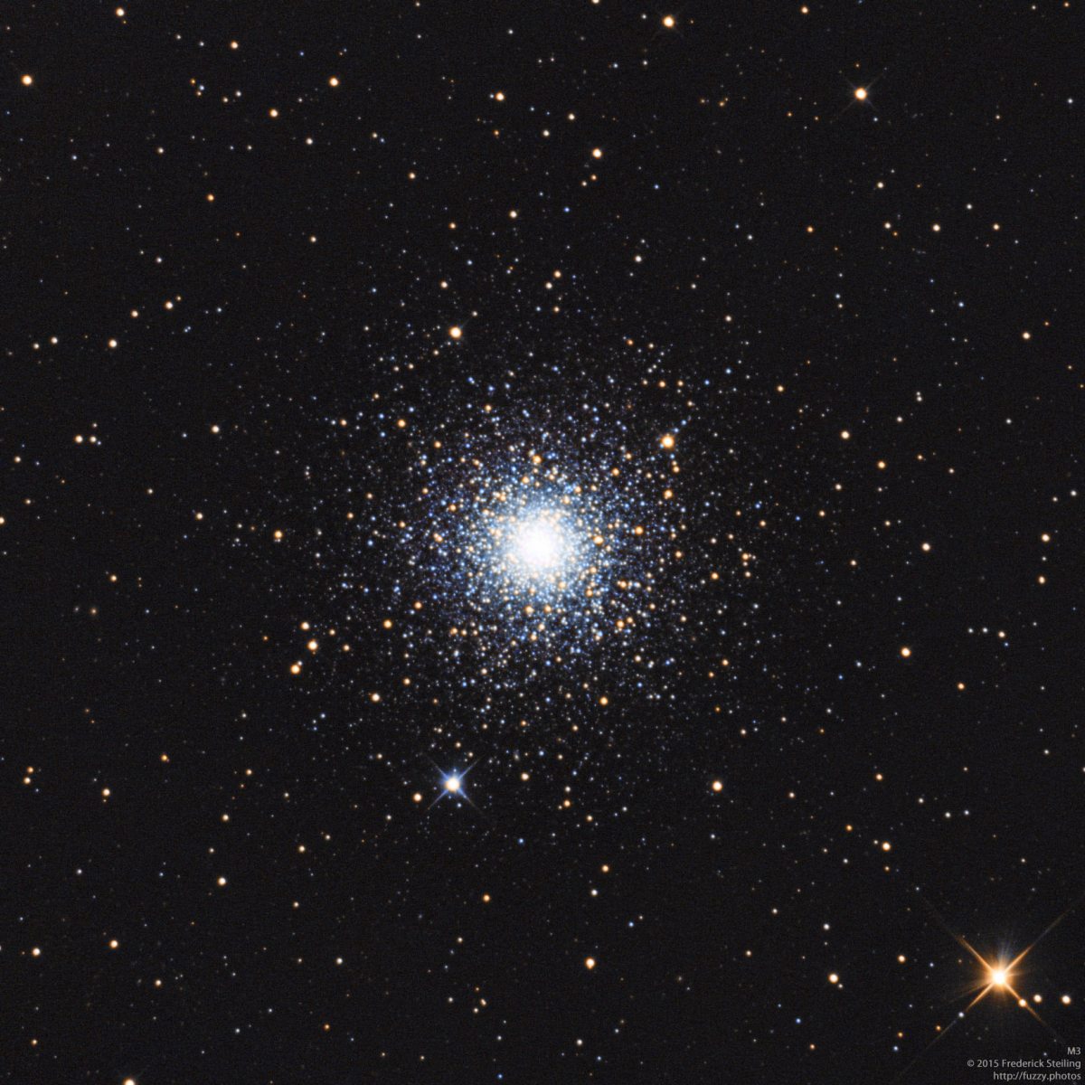 At a "paltry" distance of only 36,000 light years sits one of the more unique types of objects we'll find out there. Globular clusters, as their name indicates, are densely packed spherical collections of stars.  In this photo, M3 (Messier 3) proudly displays its pack of 500,000 stars, a handful of which are real treats for research.  M3 is known for its unusually high number of variable stars -- stars which vary to and fro in brightness.  274 of these variable stars have been identified in this cluster, more than have been found in any other cluster to-date.  For this reason, M3 is not only considered one of the most beautiful globular clusters in our sky, it is also one of the most intriguing as well.