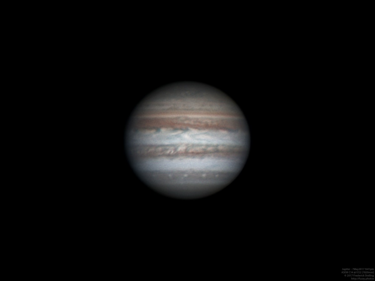 A bit of miscollimation was mildly evident through this acquisition, and while the wavelet application in Registax 6 was able to recover a significant amount of detail, I believe a little tweaking will take the imaging capability of this scope to another level. Â When we get more clear sky opportunity, I'll get a little more familiar at ASEM's observatory, and will attempt my next lunar and planetary challenges. Â But with this image, we see what this scope is capable of, and are able to take in the artistic churning of the gas giant's clouds.