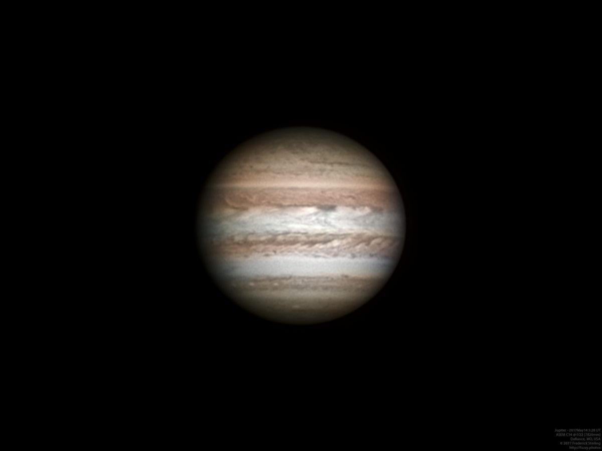 I was fortunate to get access to the club's C14 again, this time on a slightly better night than my last attempt at Jupiter a week prior.  "Slightly better" in the humid spring months near St. Louis doesn't mean much, but every little bit counts, and even by a quick comparison it is immediately obvious that the atmosphere gave us a little better look into the luscious swirls of the gas giant's bands.