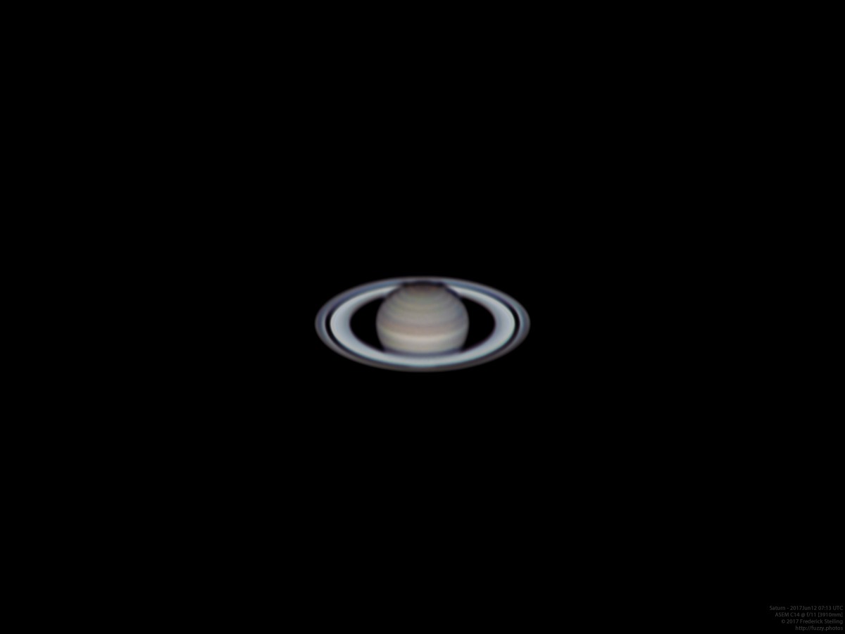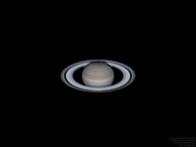 This is my inaugural Saturn photo from the club's C14 scope, and I'm very encouraged by the quality of images I'm starting to get from it.  After a quick look at the splendid Cassini Division (the large gap in the rings, originally discovered by Giovanni Domenico Cassini in 1675), we can see some more delicate features courtesy of the giant aperture of this scope.  First, some separation in the cloud bands has become evident throughout the northern hemisphere of the planet, a feature we're quite used to seeing on images of Jupiter, but a more fleeting feature with Saturn because of the lower contrast difference between them.  These faint clouds have little else that is unremarkable about them, boasting wind speeds up to 1800 km/h (1120 mph)!