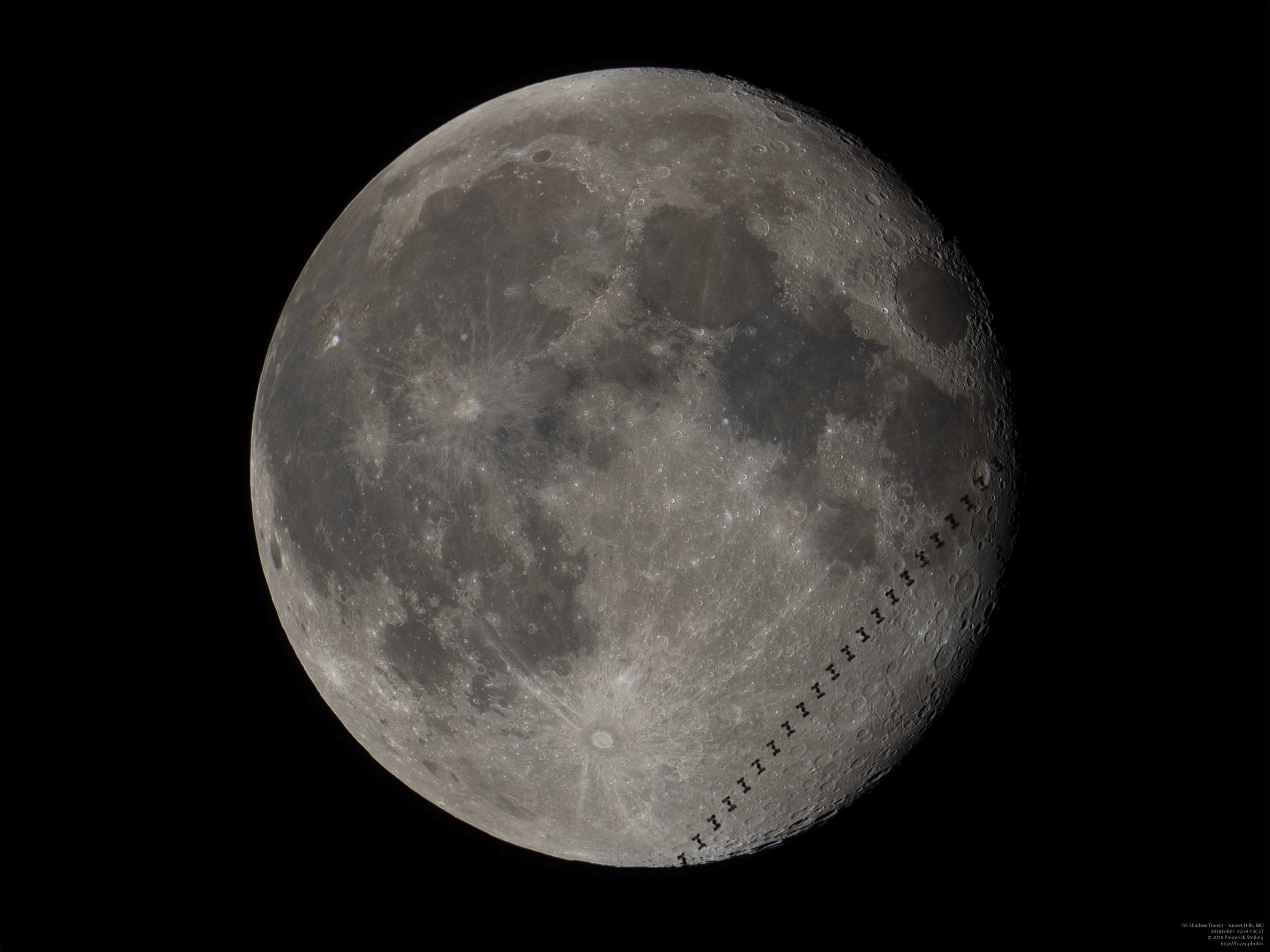 In a fleeting moment, one could miss this curious celestial event, and that if you even knew it was coming! Thanks to the handy Transit Finder, I was made aware of a lunar transit of the ISS very near my home location. Though the ISS passed overhead in the shadow of earth, it made a quick cloaked appearance across a nearly-full lunar disc. You can't blink -- and the camera can't quit -- for an event like this. From where I sat (only about a mile from the center line in Sunset Hills, MO), the off-center transit at this location lasted a whopping three-quarters of a second -- only good for 23 frames in a standard 30Hz video as seen in the raw capture I posted of this event (via YouTube)! In the composite above, we see the solar panels flanking the center service system of these 23 frames overlayed on the evening's moon captured just prior to the transit. It's a fascinating look for many seeing it for the first time, as it may not be immediately considered that the ISS doesn't travel in an orientation square to its path of travel.
