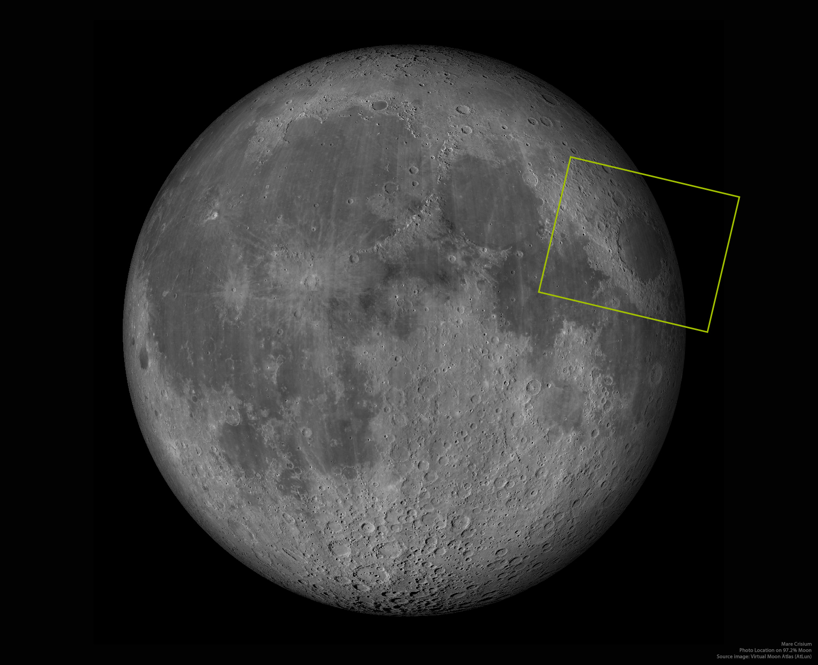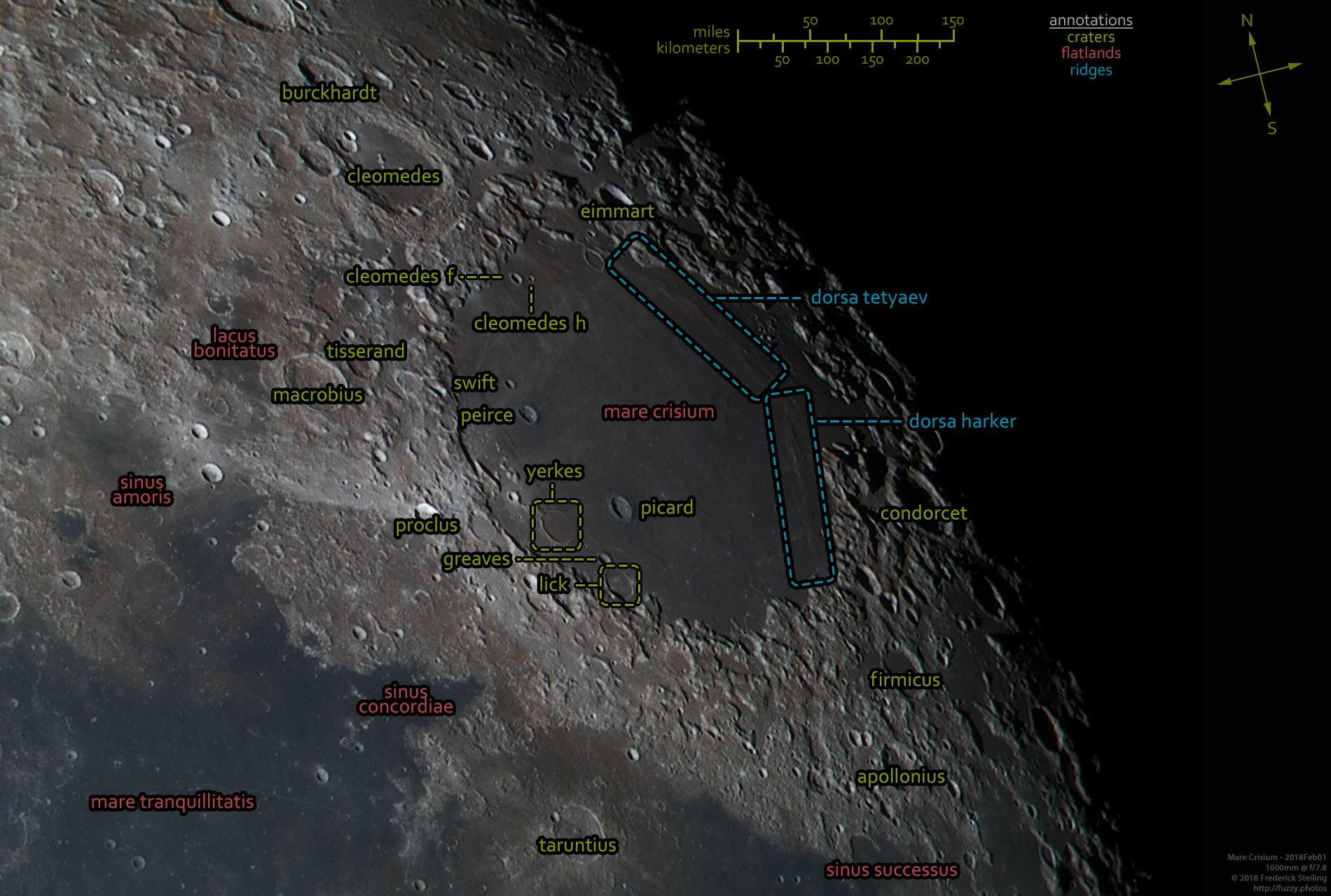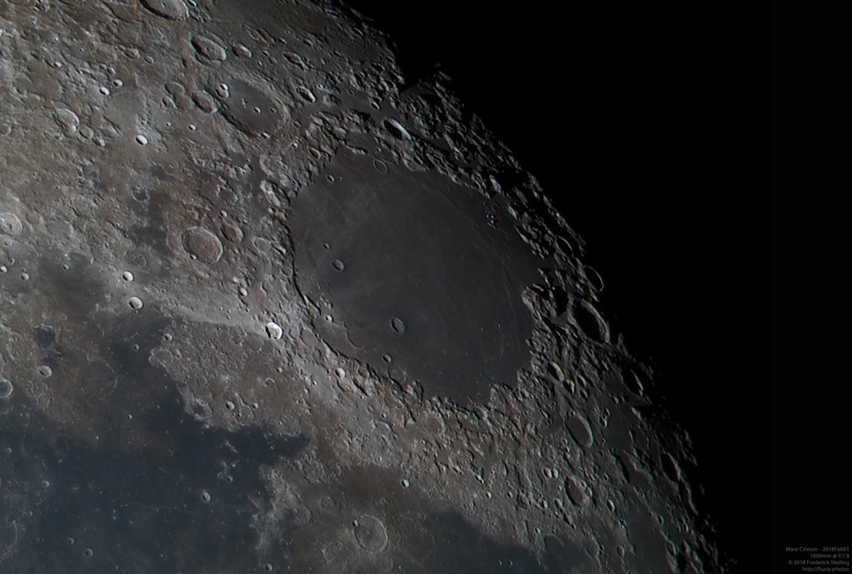 Our interest doesn't stop with the colorful beauty, however. The focus of this image is a large circular plain with a huge variety of interesting periodic landscapes embedded in a wild range of craters and flatlands beyond the reach of its walls. Coined as the Mare Crisium (the "Sea of Crises"), this prominent lunar feature spans 375 miles in its longest dimension, about the same width of the state of Colorado. On its eastern edge lie 2 small wrinkle ridges, Dorsa Tetyaev and Dorsa Harker, ranging 91 and 121 miles each. Toward its west are a spattering of deep cratered pits that include Greaves (9 miles in diameter with 5900ft walls) and Picard (14 miles in diameter with 6700 ft walls). Lastly in a disappearing act at the western edge are the "almost-ghost" craters Yerkes and Lick, spanning 19 and 22 miles in diameter and barely presenting themselves over a historic floor of lava that filled their original depth millions of years ago.