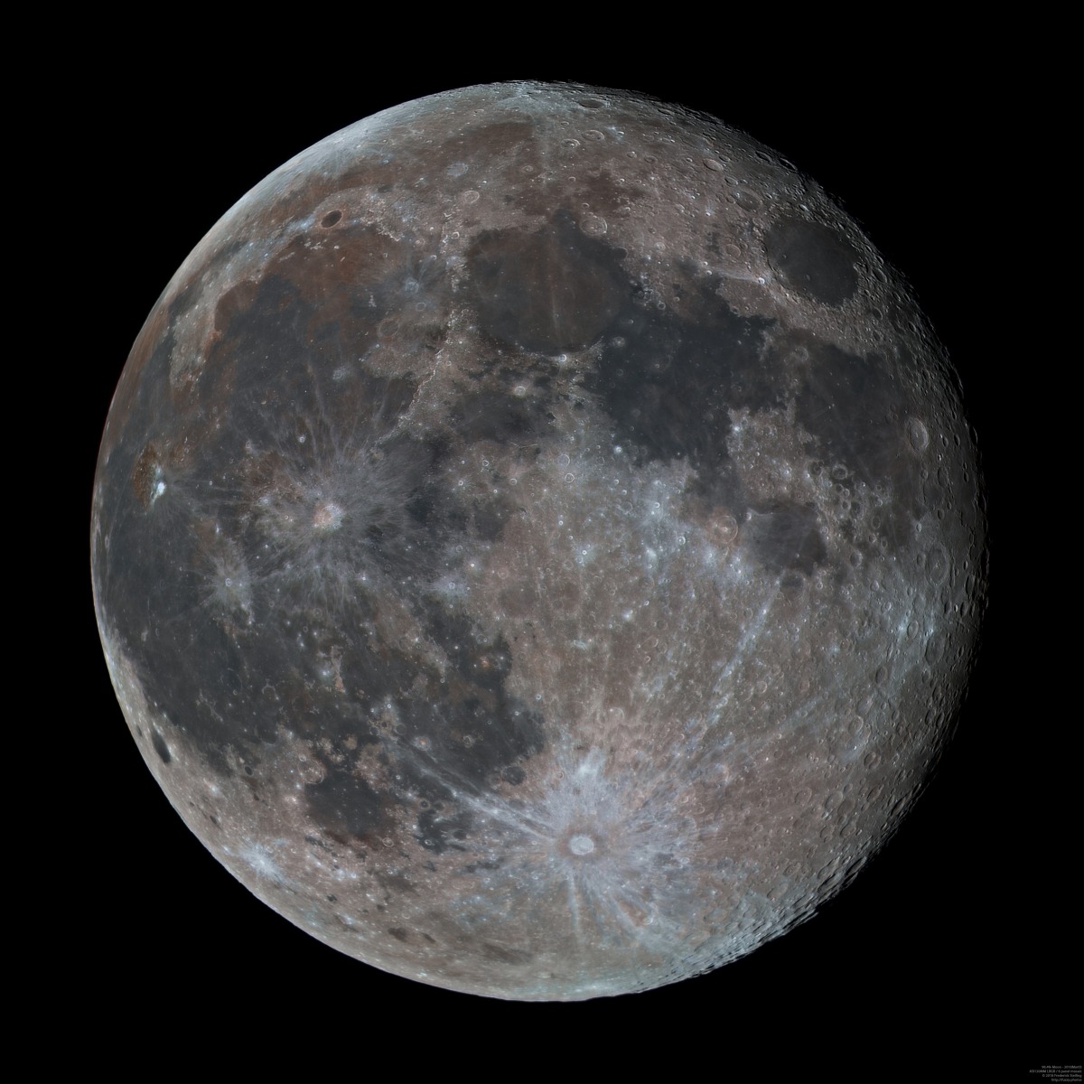 Two remarkable features generally stand out in this photo beyond the added lunar detail. First, a glimpse at the full moon in color gives a real sense as to the material division in various lava flows in the lunar Mare and Sinus features, a distinction indicative of different iron, titanium, and magnesium compositions. Second, we can make out grand ray traces from major impacts, namely from Tycho toward the lunar south and Copernicus at the west-center. These ray traces really give some perspective on how massive these impacts must have been.