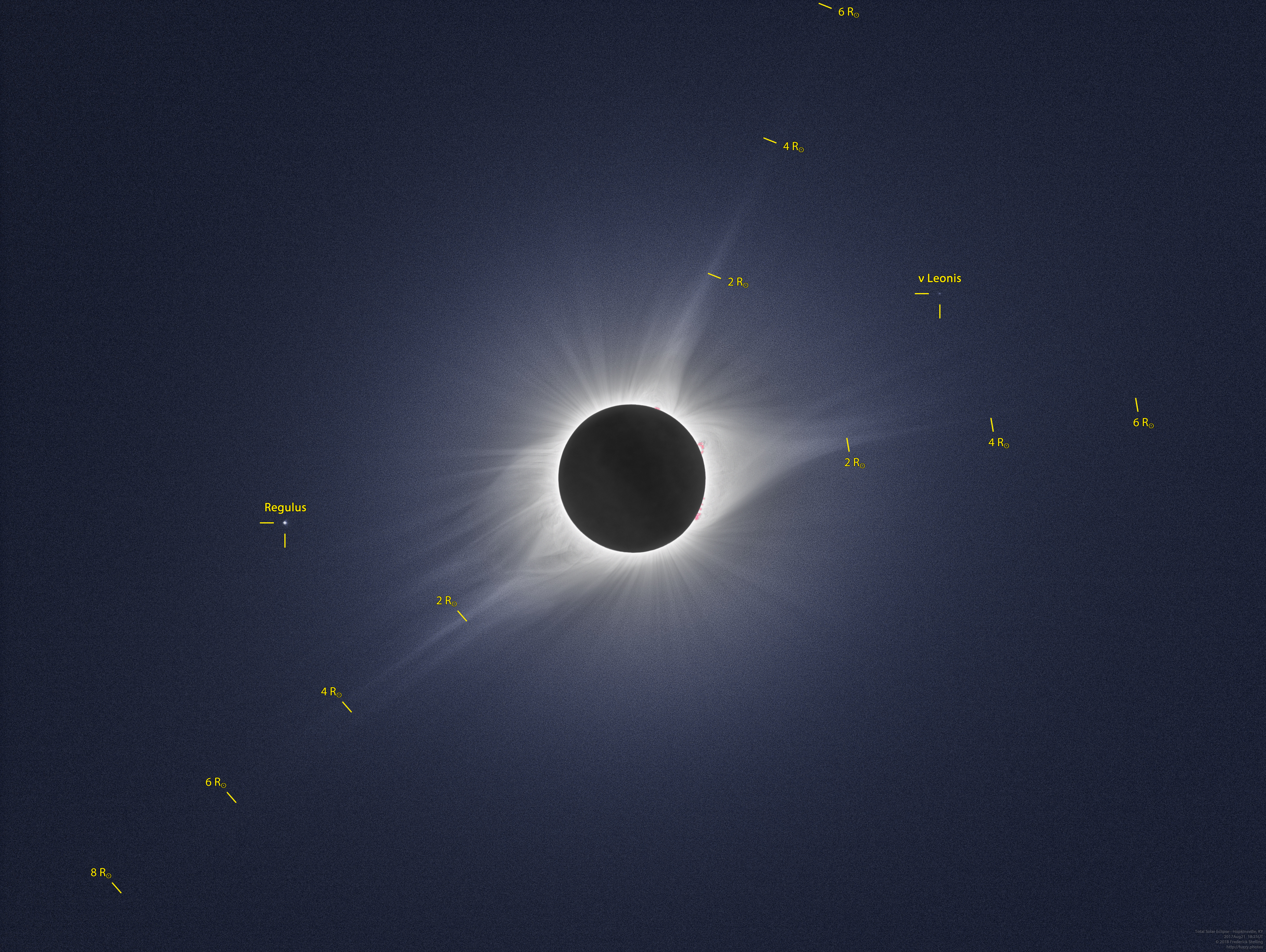 - Lastly, thanks to a "modest" 8s exposure at f/5.6, we can trace coronal vestiges out to a whopping 6 solar radii! Though the corona extends further than this, this exposure of the streams' incredible reach is another surprise accomplishment in what was otherwise a "let's just try it out" set of exposures.  The solar radii distances are designated on 3 different streams in the annotated image.