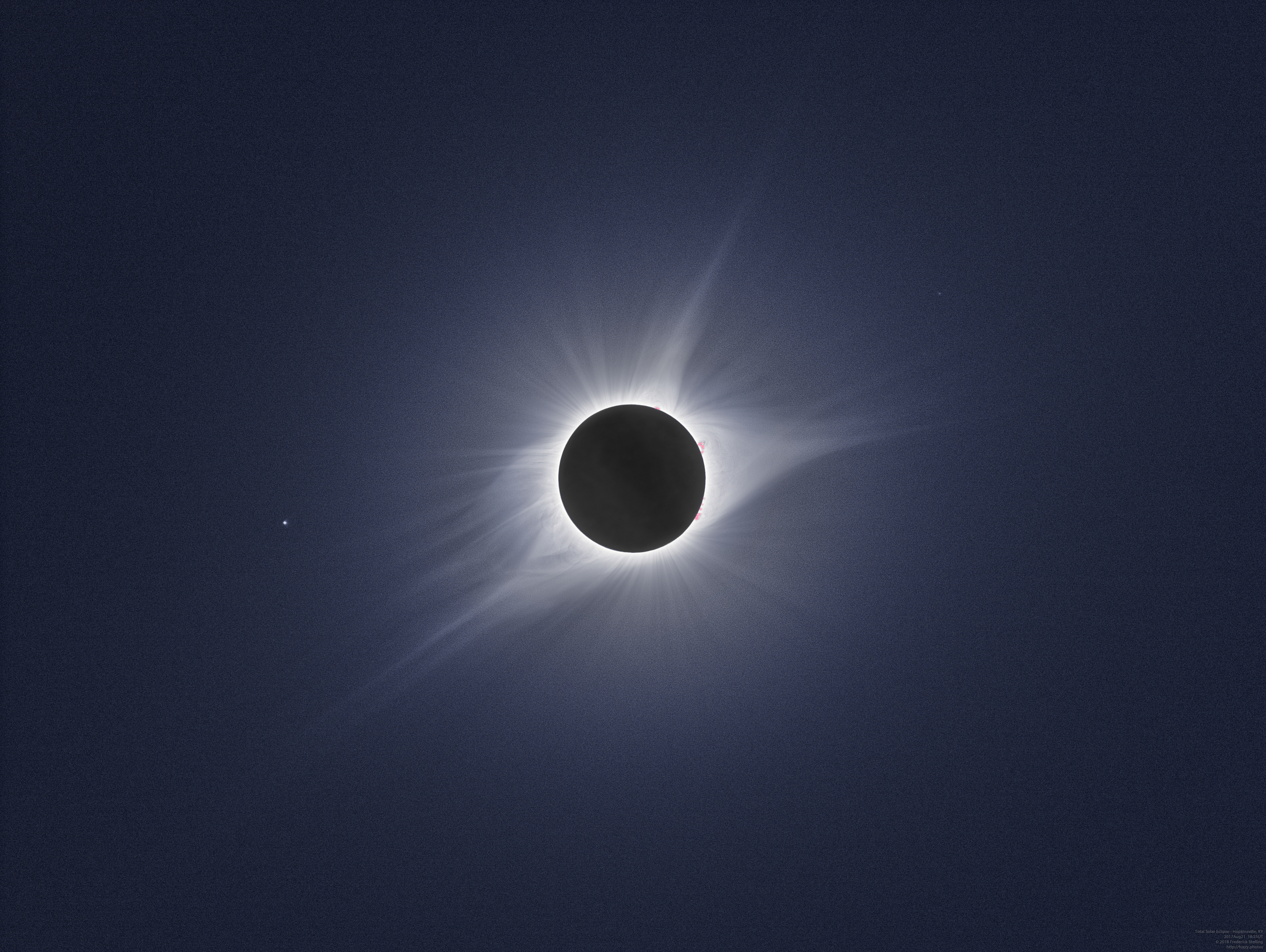 Though the data was a bit soft due to focus, I was eventually able to recover outer eclipse detail and restored the center corona, prominences, and moon with the data I had from my Newt. There are many new things to enjoy in this view as compared to my prior post with the inner corona detail: