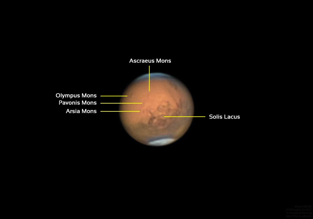 In addition to the timing and conditions of this photo being very good, I also lucked out on the current rotation of the planet, which was such that 4 of the volcanic Martian mountains are clearly evident (see the annotated image here). The largest of the volcanoes, Olympus Mons, stands at an extraordinary 25 km (72,000 ft), more than 2.5x the elevation of Mount Everest above sea level. At the ground surface to the southeast of the volcanoes sits the dark feature Solis Lacus, a Martian area well-known for its constantly changing appearance. Here we see it after emerging from the global dust storm in what is most certainly an altered view from just a month ago. With piqued interest, I plan to compare its appearance across the many Martian data sets I've taken this year to demonstrate its ever-changing look.