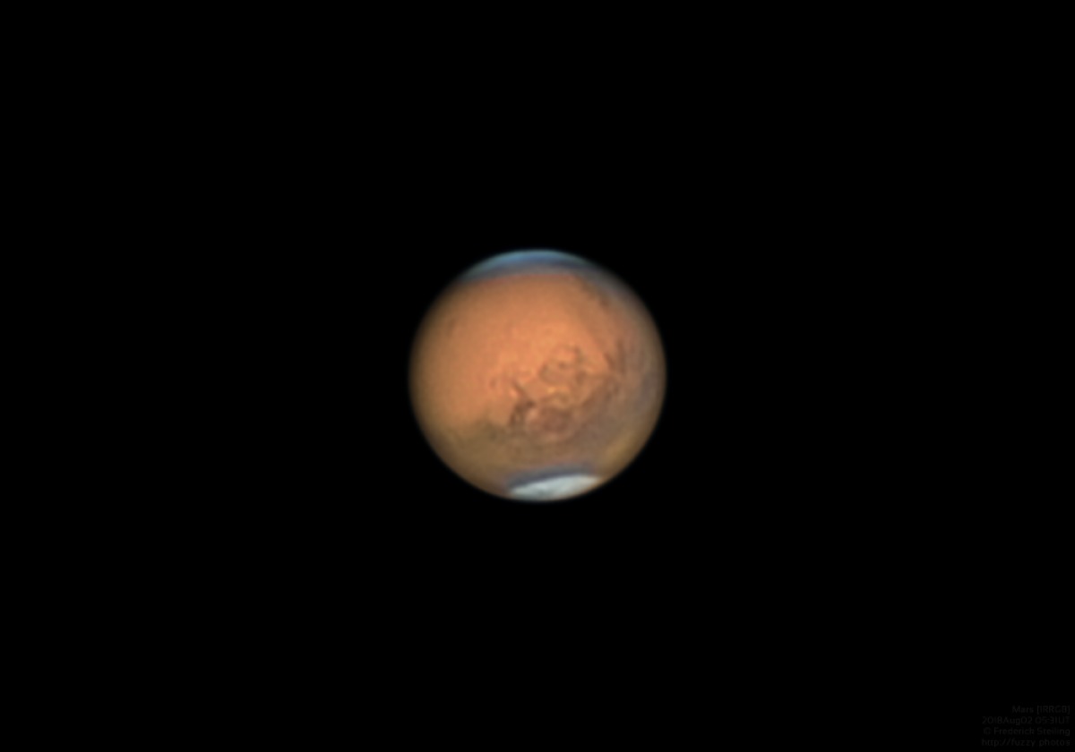 In this IRRGB combination, I've taken a different approach to filter combination to try to get the best of the IR detail and the "trueness" of the straight RGB color and polar detail. The IR filter does a stupendous job cutting through our atmosphere to glean excellent surface detail, but as you might expect, it excels only in the redder areas. While this is the dominating feature of Mars, it often kills the southern polar cap and northern polar hood, amazing features which would otherwise stand proudly with prominence in the blue channel. As a compromise, I've used masking to add the IR luminance only over the red surface areas, have left the polar hood untouched from the RGB combination, and have blended IR to the southern cap so achieve a balance between detail and color.