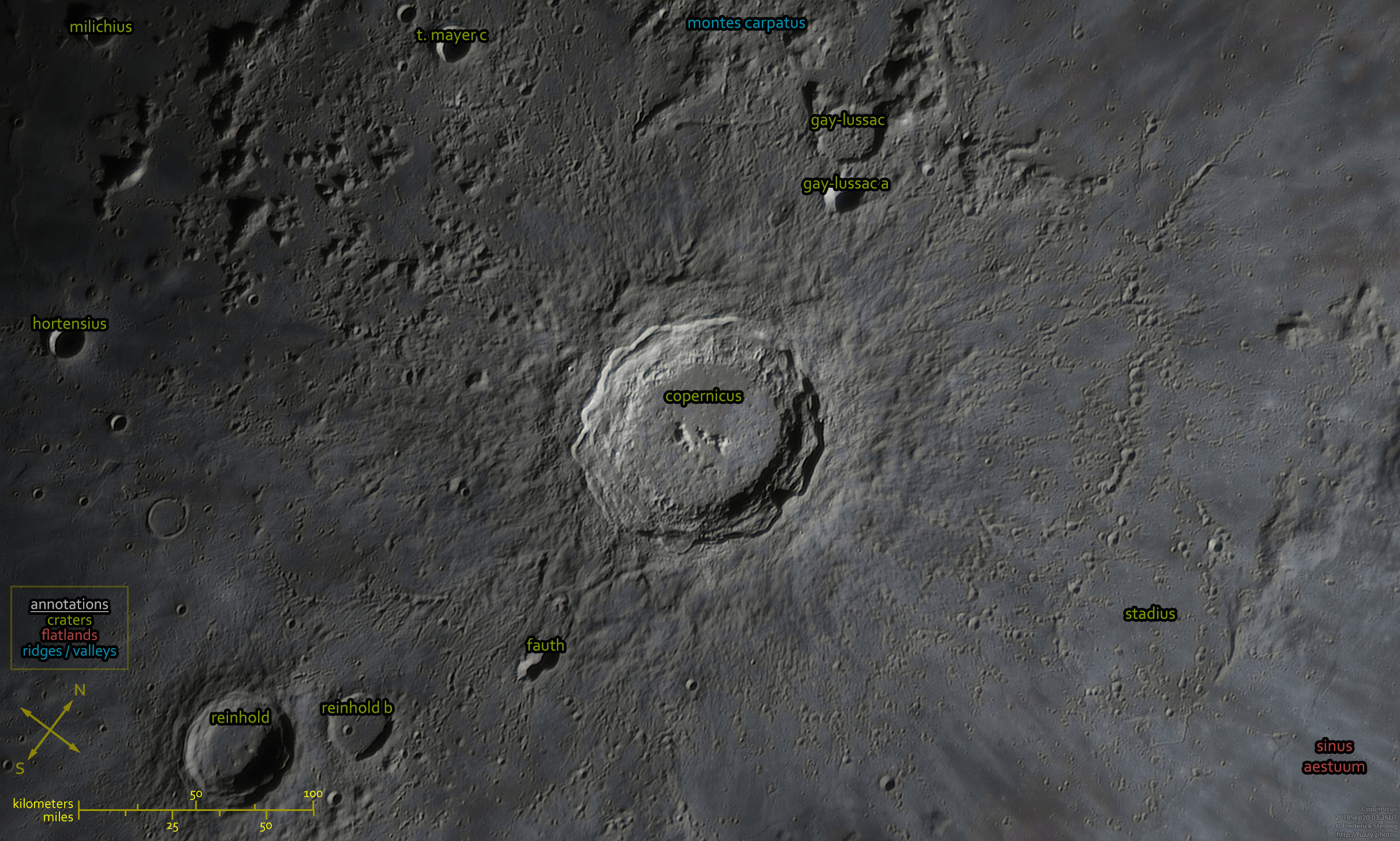 Copernicus' ray traces (spray from the original impact) are usually very noticeable from wider views. In this magnified view, we instead can focus on the subtle variations they produce in the flat areas around the crater, giving slight variations between blue and rusty hues in this RGB image. Scattered about are various deep craters, such as the 12km (7mi) bowl Fauth and the 15km (9mi) companion Hortensius. A remarkable ghost crater, Stadius, also makes a dim appearance. This crater once was a full bowl as the others in this image, but was subsequently filled with the lava flows associated with the nearby Mare Insularum.