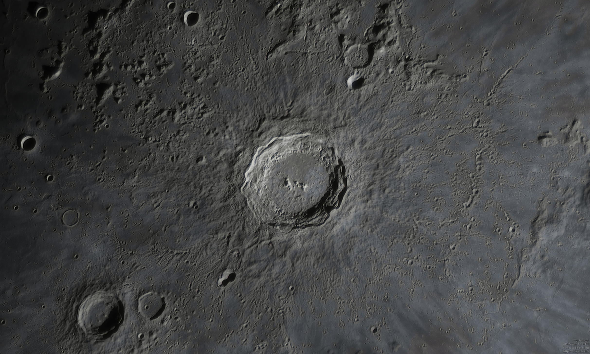 One of the most prominent craters on our side of the moon is Copernicus, a grand 93km (53mi) impact remnant sitting in a largely flat area of the western side of the lunar face. I've imaged this area in detail before, but then with my trusty 8" Newtonian scope. Here, we've taken full advantage of the 14" aperture on the C14 along with the added focal length to squeeze out some remarkably fine detail in this area, uncovering more than we may have noticed otherwise!